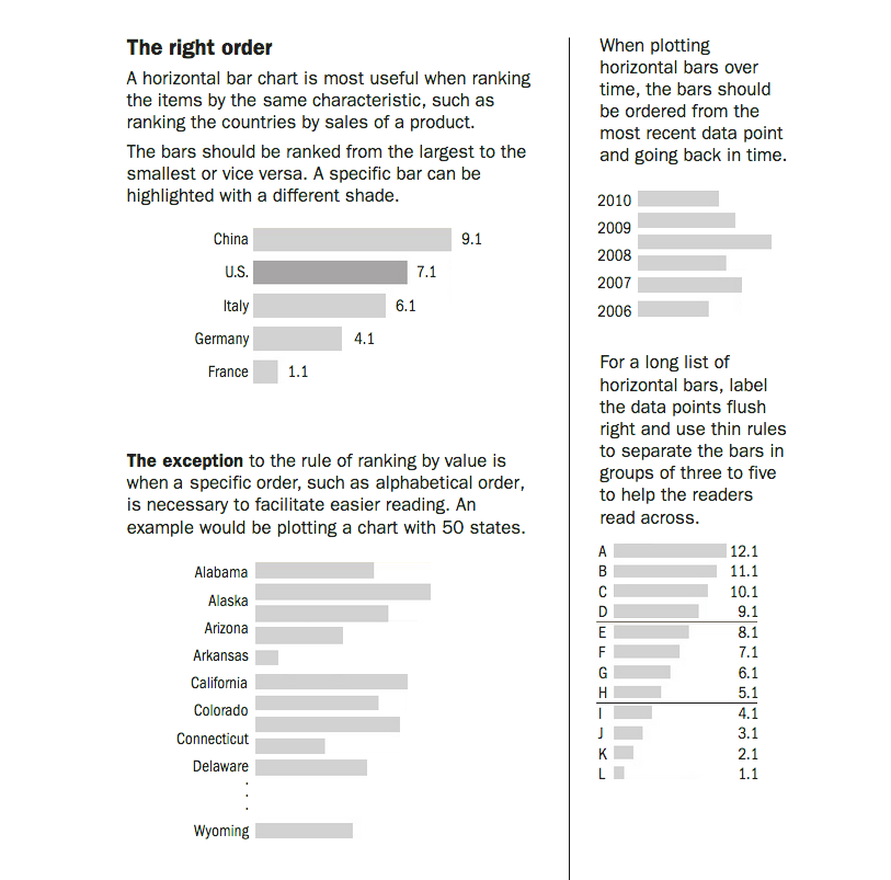 Numbers are more than just important to the Wall Street Journal. And for a wide variety of cases, the simple bar chart is well suited. Dona Wong’s Wall Street Journal Guide to Information Graphics provides a clear and concise guidelines to presenting business data clearly to people who use it.