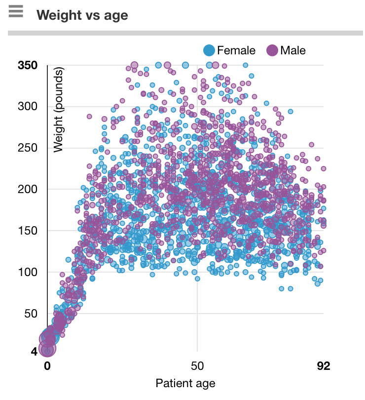 The CDC National Ambulatory Medical Care Survey provides a broad sample of US outpatient visits. The case forms collect detailed vital signs on each patient, including height and weight. Using this we can plot the raw data. Access it here...