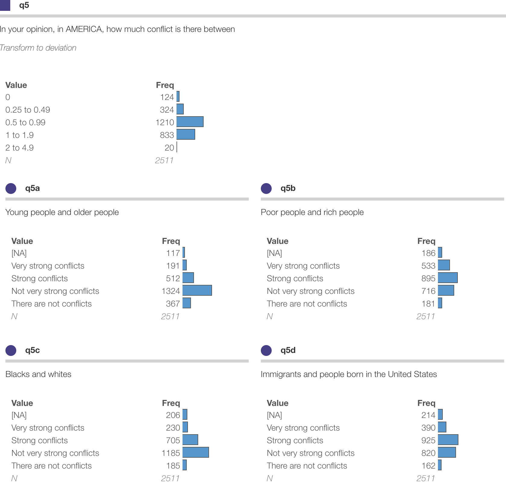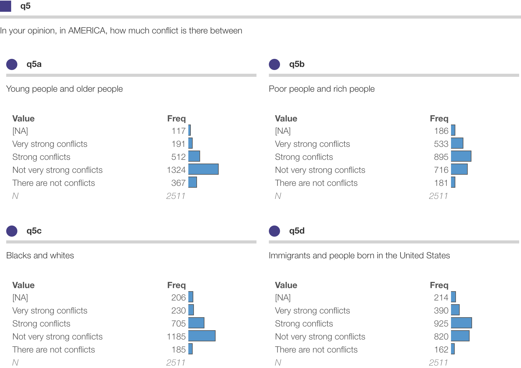 Here there are 25 respondents who said "Very strong conflicts" to every question in this section. And 8 who respondend "There are not conflicts " to every question.