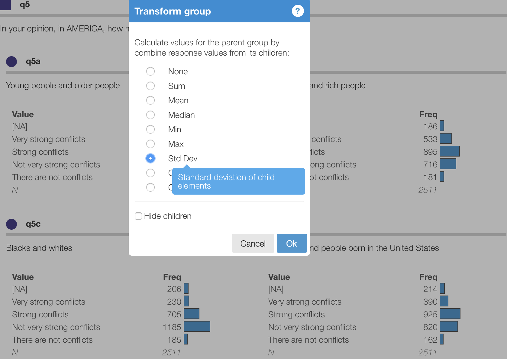 This will calculate the standard deviation for that section for each respondent and show the result as a distribution.