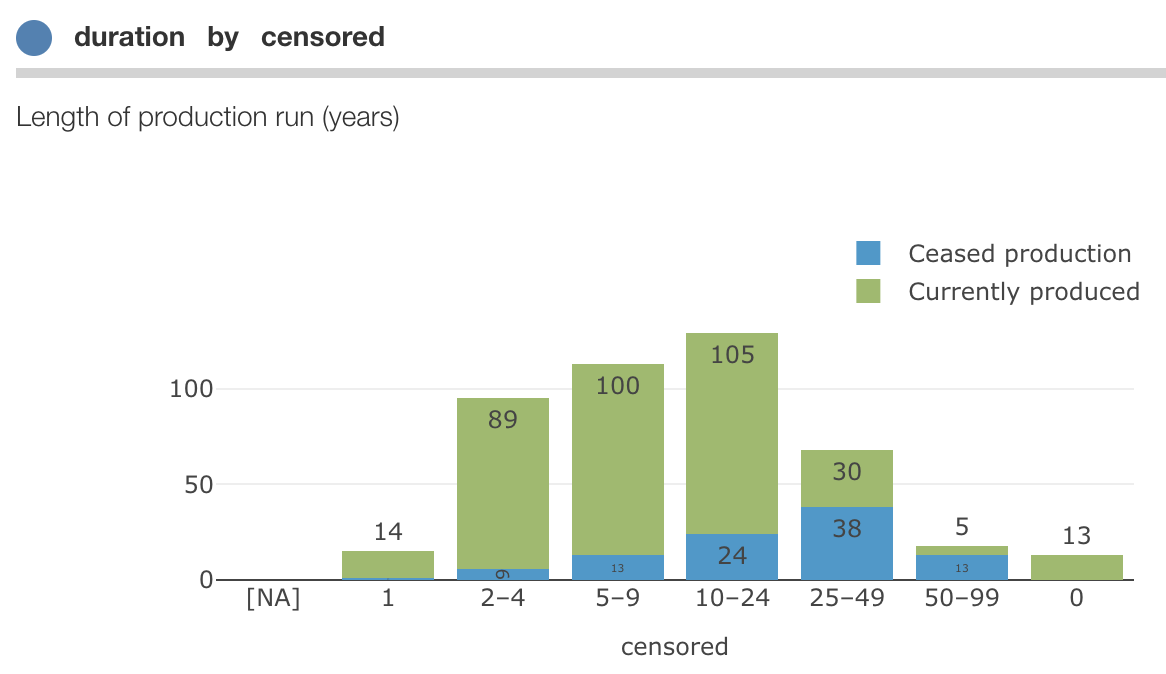 Here we can clearly see that many production runs are still ongoing. So a simple mean or median of run lengths to-date would seriously under-report the expected production runs.