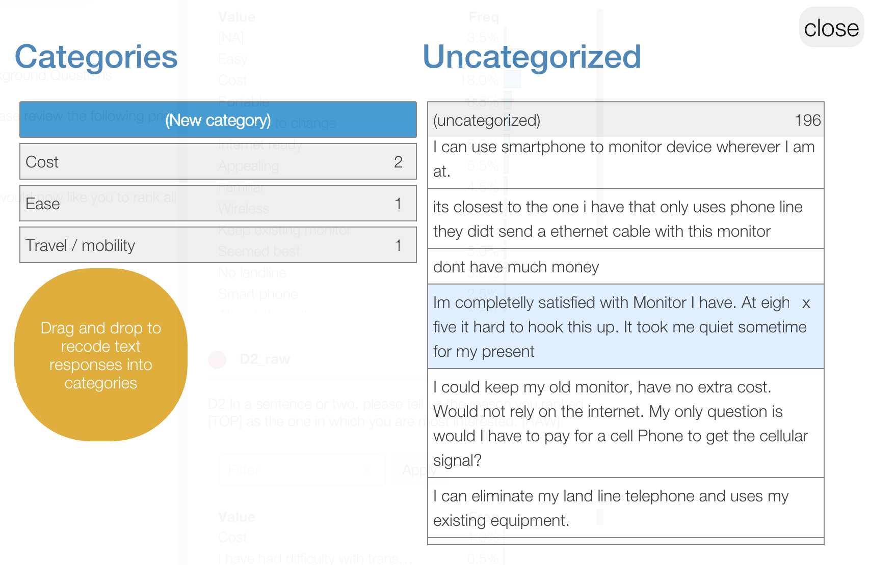 In this project, the client coded raw verbatim text responses from each respondent into categories. Some responses included compound answers that were coded to more than one concept, e.g. "Affordable and easy to use".