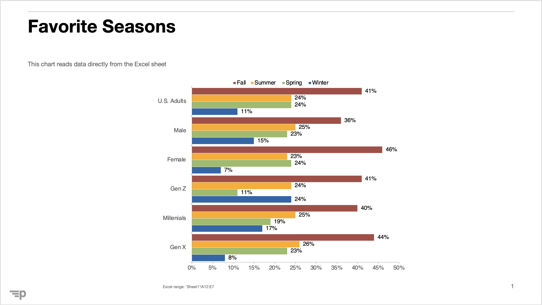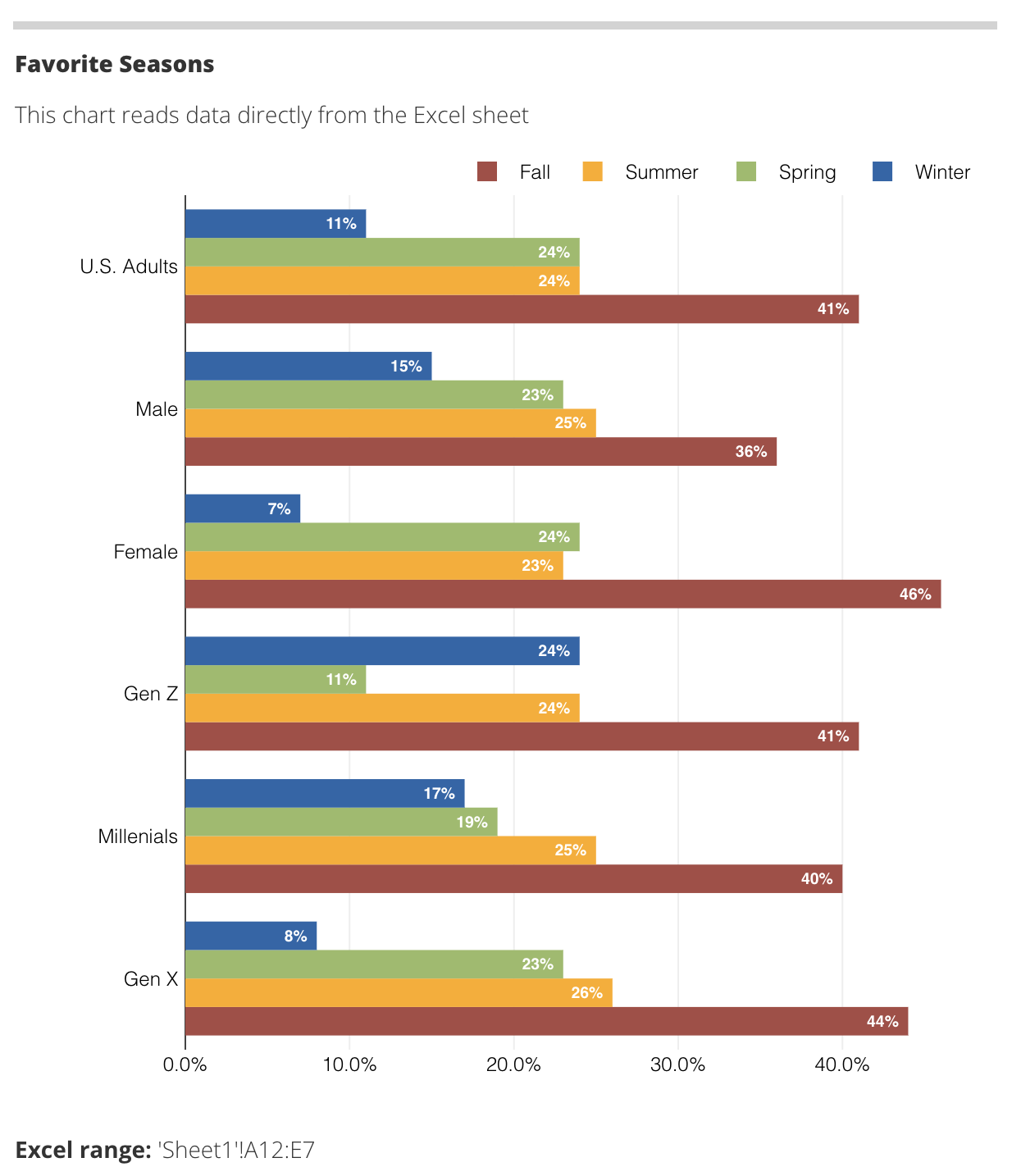You can also include charts in Protobi based on external data that directly read data from Excel ranges, independent of respondent-level data. This feature can be particularly useful when you want to include secondary data (e.g. Census data) or aggregate calculations (e.g. tempered projected preference shares) based on your firm's proprietary algorithms.