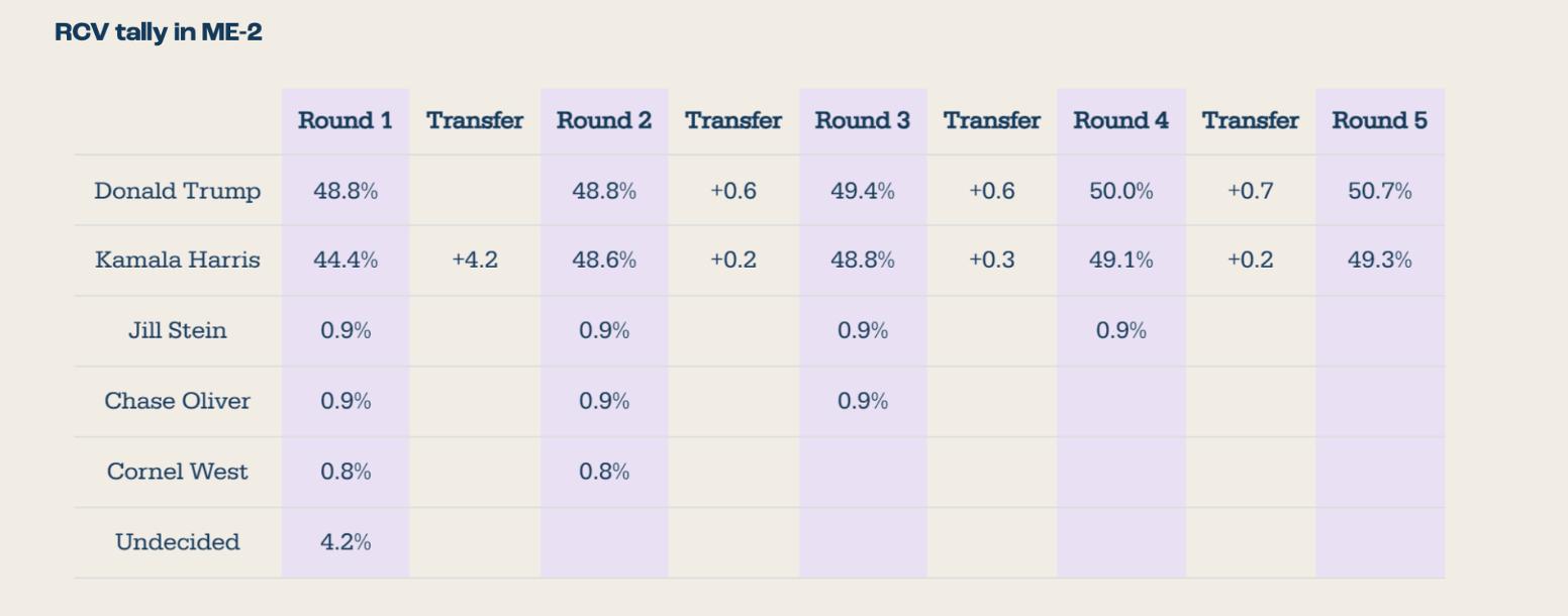 Limitations: Does not show how votes transferred between candidates or how exhausted ballots affected the outcome. Lacks vote totals by round, offering limited insight into the mechanics of RCV beyond the elimination order.