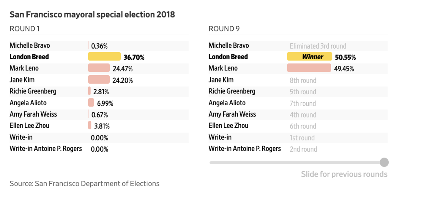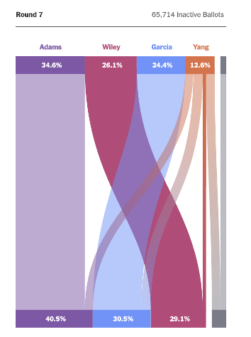Visualizing ranked choice voting (RCV) presents a unique challenge, with multiple rounds, candidate eliminations, and vote redistributions to convey. Different outlets have tackled this challenge in creative ways.