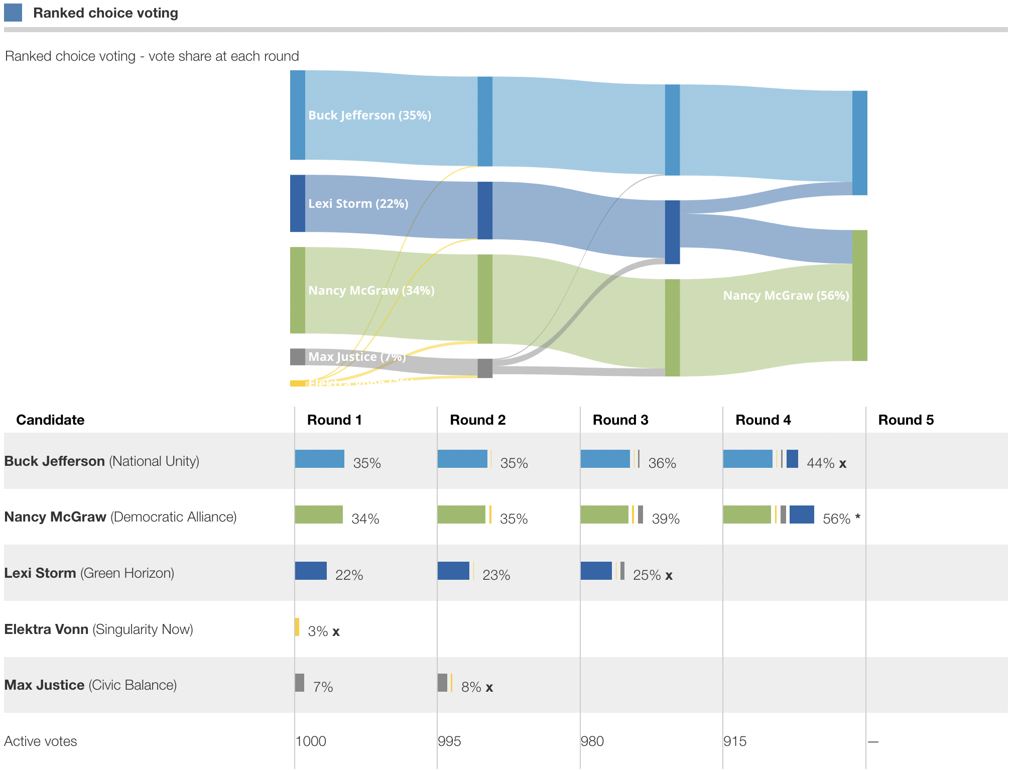 Advantages: These charts show how each candidate’s vote share evolves across rounds, highlighting the impact of eliminations and transfers. They are particularly effective in emphasizing how lower-choice rankings influence final outcomes.